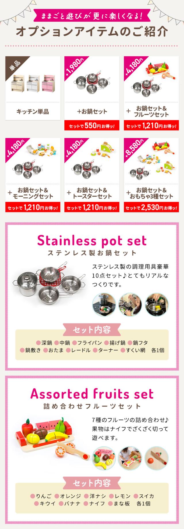 | ※[店舗管理用 URL]a12925 ※[品番]【ままごとキッチン本体のみ/ビーチ:a12925】【ままごとキッチン本体のみ/ホワイト:a12926】【ままごとキッチン本体のみ/ピンク:a12927】【本体+お鍋セット(+1980円)/ビーチ:a13684】【本体+お鍋セット(+1980円)/ホワイト:a13685】【本体+お鍋セット(+1980円)/ピンク:a13686】【本体+お鍋+フルーツ(+4180円)/ビーチ:a13708】【本体+お鍋+フルーツ(+4180円)/ホワイト:a13709】【本体+お鍋+フルーツ(+4180円)/ピンク:a13710】【本体+お鍋+モーニング(+4180円)/ビーチ:a13692】【本体+お鍋+モーニング(+4180円)/ホワイト:a13693】【本体+お鍋+モーニング(+4180円)/ピンク:a13694】【本体+お鍋+トースター(+4180円)/ビーチ:a13700】【本体+お鍋+トースター(+4180円)/ホワイト:a13701】【本体+お鍋+トースター(+4180円)/ピンク:a13702】【本体+お鍋+おもちゃ3種(+8580円)/ビーチ:a13716】【本体+お鍋+おもちゃ3種(+8580円)/ホワイト:a13717】【本体+お鍋+おもちゃ3種(+8580円)/ピンク:a13718】 |