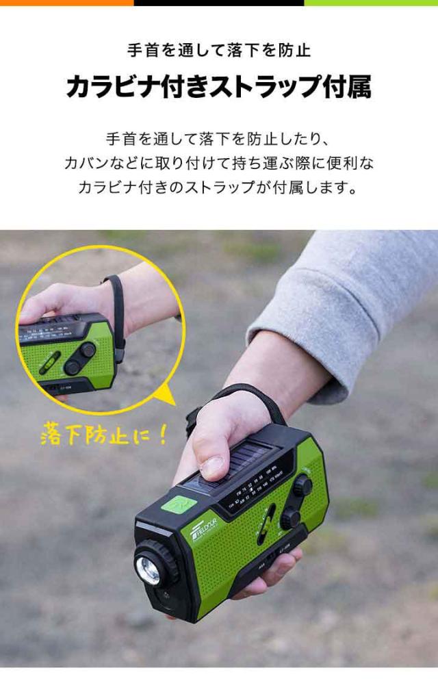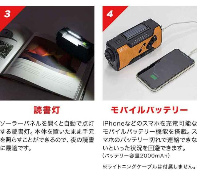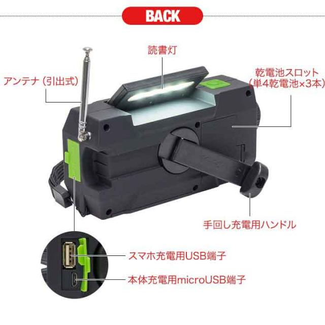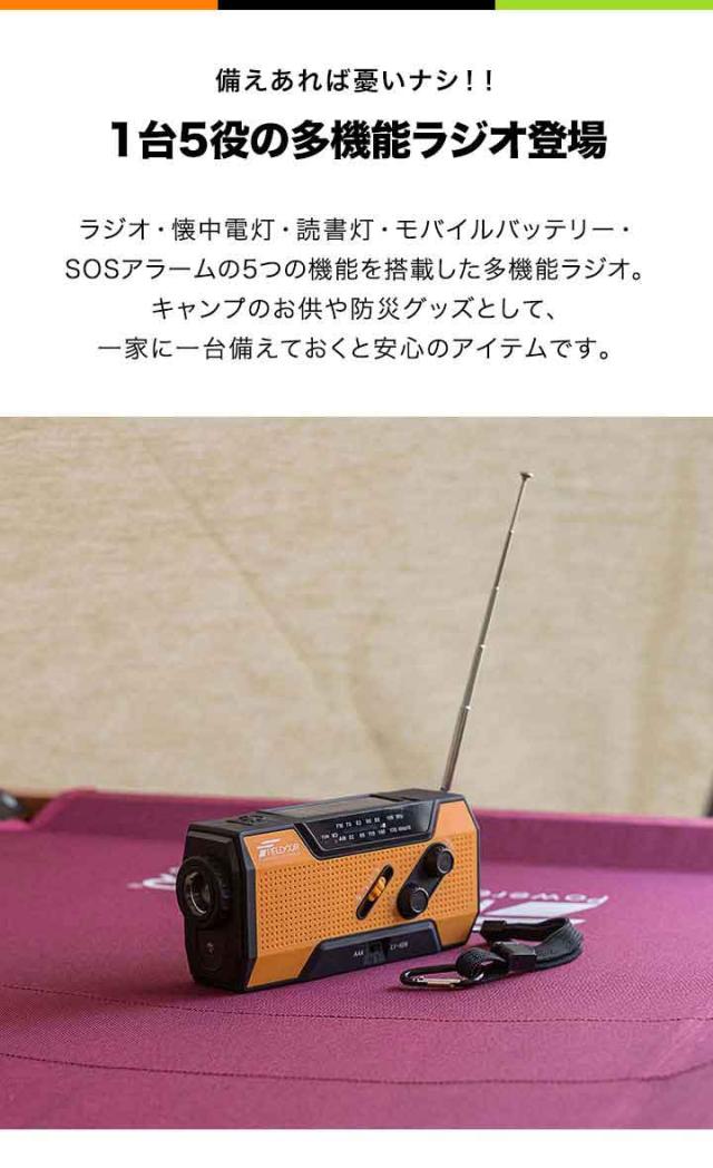 AM/FMラジオ/懐中電灯/読書灯/モバイルバッテリー/SOSアラーム