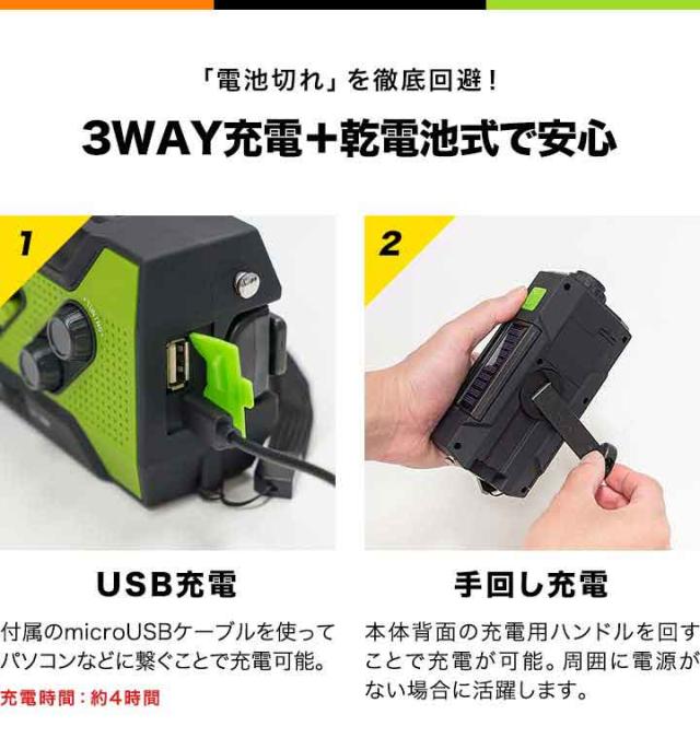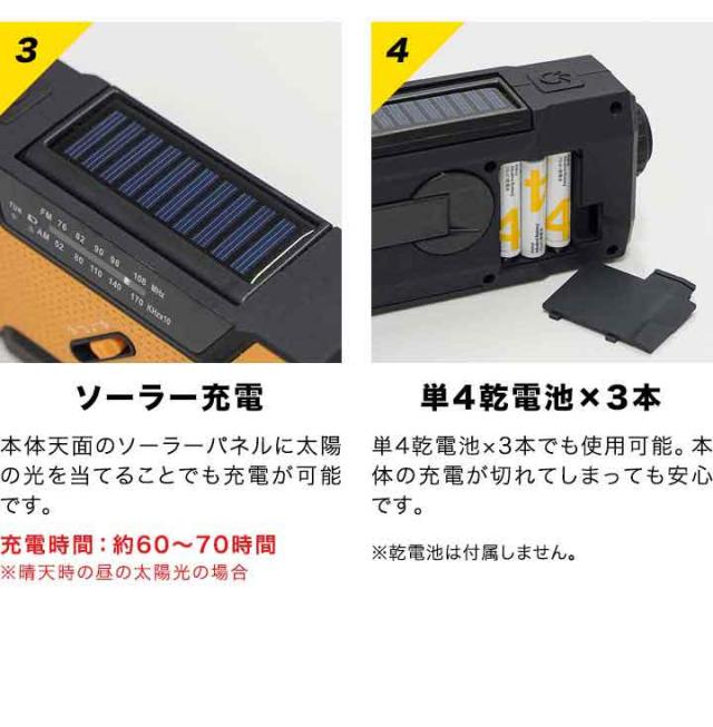 USB充電/手回し充電/ソーラー充電/単4乾電池×3本