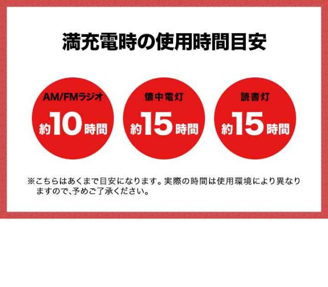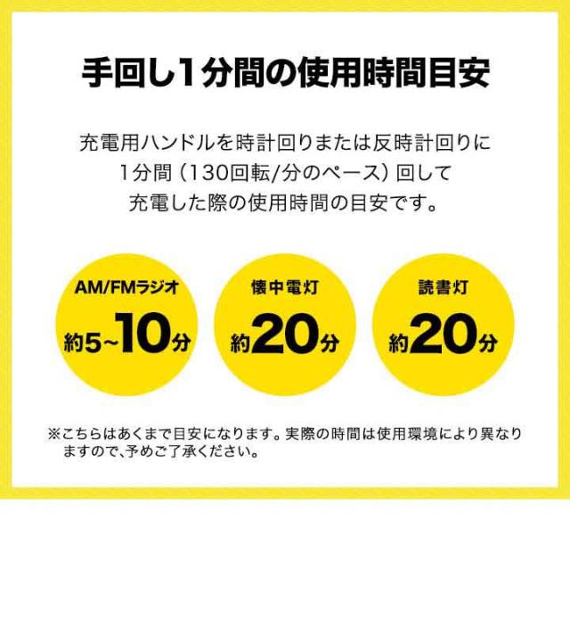 | 連続使用時間: AM/FMラジオ:(約)10時間 懐中電灯:(約)15時間 読書灯:(約)15時間 【手回し充電1分間(130回転/分)での使用時間】 AM/FMラジオ:(約)5〜10分 懐中電灯:(約)20分 読書灯:(約)20分 ※こちらはあくまで目安になります。実際の時間は使用環境により異なります。 |