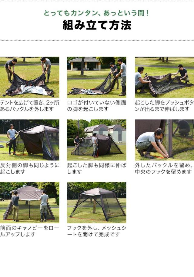 | 付属品: ・スクリーンテント本体 ・キャノピーポール×2本 ・ロープ×6本 ・ペグ×10本 ・プラスチック製ハンマー×1本 ・キャリーバッグ ・取扱説明書 / 保証書 |
