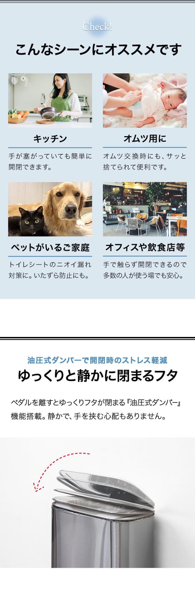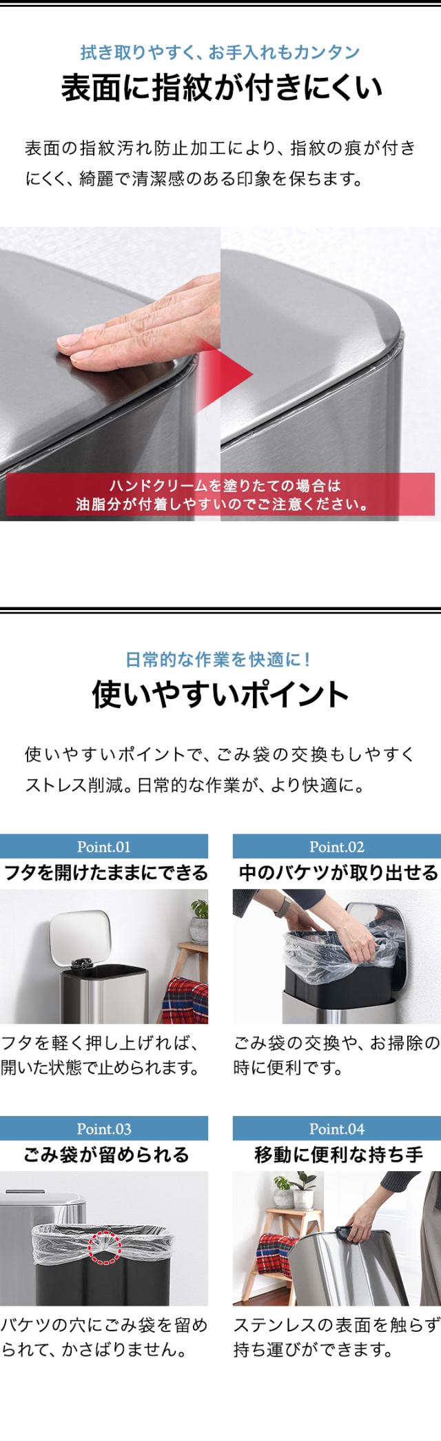 - プラスチックの物はどうしても、年数たつと臭いが発生する為、始めてステンレス製のゴミ箱を購入してみました。プラスチックの物より値段はしますが、とても良い商品でした。長持ちしそうだし、もし壊れた際はまた同じ商品を買うつもりです。