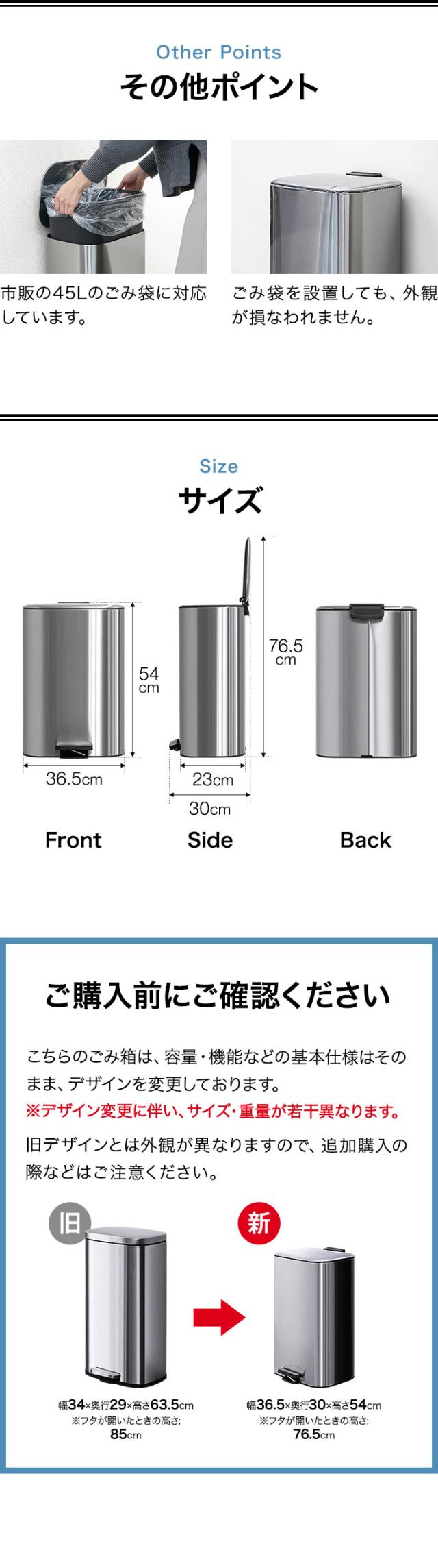 | サイズ: (約)幅36.5cm×奥行30cm×高さ54cm ※フタを開けた時の最大高さ:(約)76.5cm インナーバケツのサイズ:(約)幅36cm×奥行23cm×高さ49cm |