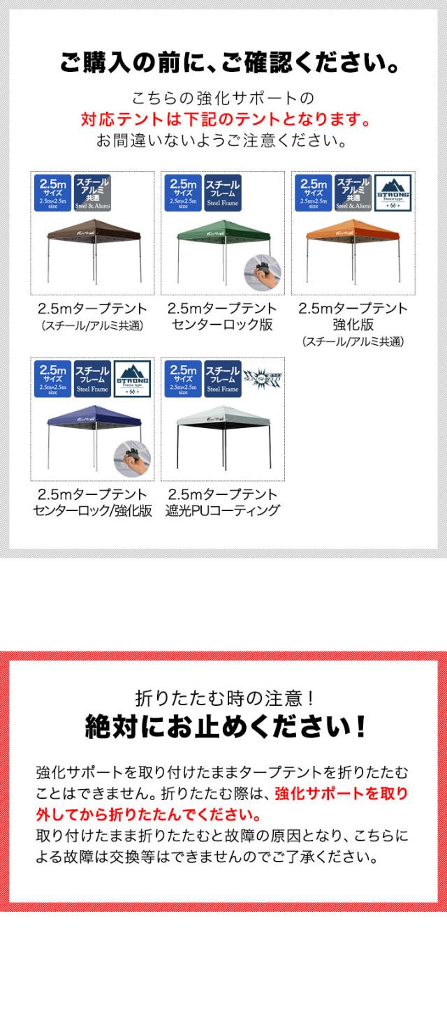 | 対応テント: ・2.5m×2.5m タープテント(スチール製・アルミ製共通) ・2.5m×2.5m タープテント センターロック版 ・2.5m×2.5m タープテント 強化版(スチール製・アルミ製共通) ・2.5m×2.5m タープテント センターロック/強化版 ・2.5m×2.5m タープテント 遮光PUコーティング |