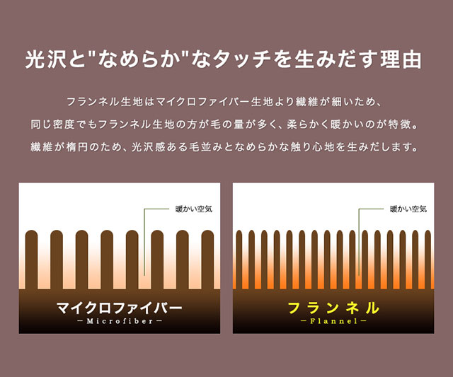 超極細繊維が密集した素材のマイクロファイバー生地より細い繊維のフランネル。マイクロファイバーと同じ密度でも毛の量が多くなるので、より""ふかふか・柔らかい""のが特徴。そして、繊維が楕円になっていることで光沢感が生まれ、美しい毛並みに。起毛も抜けにくく、この極上な触り心地をご堪能してみてください。