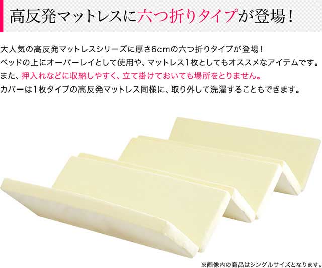大人気の高反発マットレスシリーズに厚さ6cmの六つ折りタイプが登場!ベッドの上にオーバーレイとして使用や、マットレス1枚としてもオススメなアイテムです。また、押入れなどに収納しやすく、立て掛けておいても場所をとりません。カバーは1枚タイプの高反発マットレス同様に、取り外して洗濯することもできます。