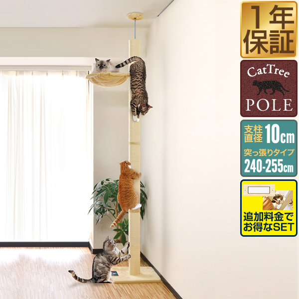 キャットツリー タワー 突っ張り ハンモック付き 全高240~255cm 直径10cm シニア 運動不足 猫ちゃん 木登り きのぼり 木登りタワー 木登りキャットポール 組み立て 設置 簡単 爪とぎ 多頭 猫 ねこ ペット ペット用品 スリム 1年保証 [送料無料]