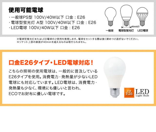 | 適合電球: 口金 : E26/40W以下×1個(LED電球・電球型蛍光灯推奨) ※電球は付属いたしません。 |