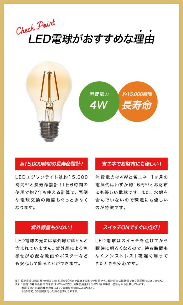 LEDエジソンライトはやさしく温かみのある灯りで、空間を演出したり輝きを楽しむのに適した電球です。通常の電球に比べ光量を抑えた作りになっておりますので、予めご了承の上ご注文くださいませ。