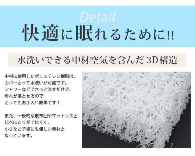 3次元スプリング構造と呼ばれている特殊構造により、柔軟性のあるプラスティック樹脂で弾力効果を発揮できる繊維形状に保ちながら、空気を含むように絡ませています。