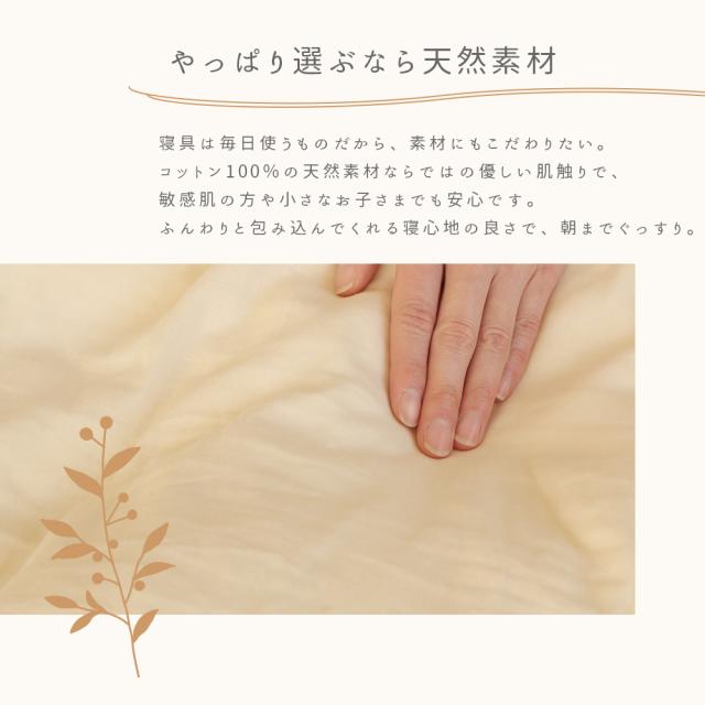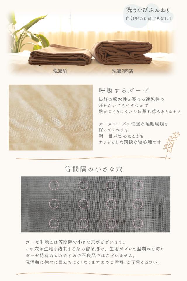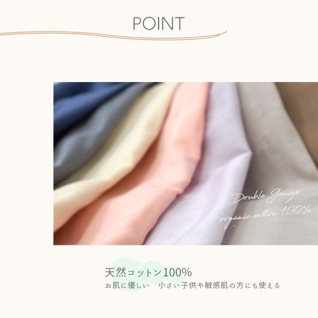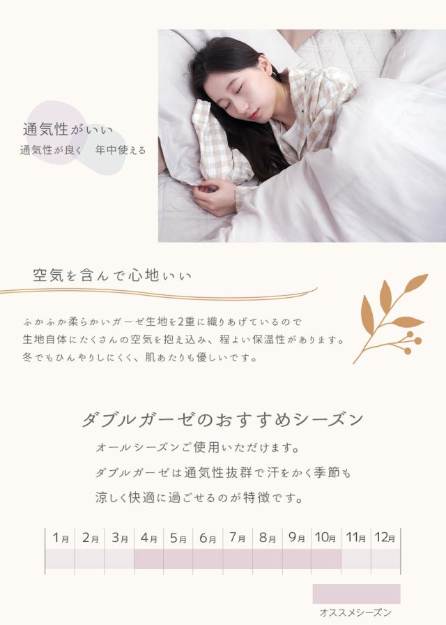 ふかふかで柔らかいガーゼを2重に織ったダブルガーゼは、肌触りがいいのはもちろん、たくさんの空気を含む特性があり程よい保温性もあります。冬場もお布団に入った瞬間のひんやり感もなく優しさに包まれます。