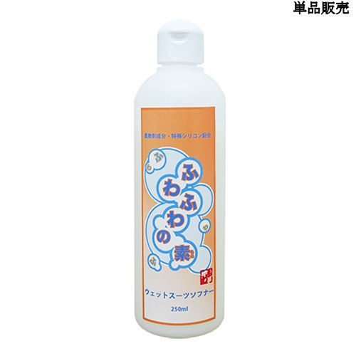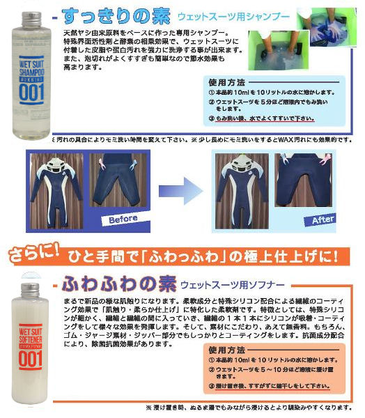 | 効果 | ・ジャージやラバー生地がふわふわさらさらの肌触り感UP! ・皮膚のスレを軽減、より動きやすくなります。 素材同士の摩擦を低減し、ウェットの長持ち効果がUP! ・抗菌成分配合により、菌の繁殖抑制や消臭効果があります。 ・防水効果があり、定期的使用でより効果が持続します。 |