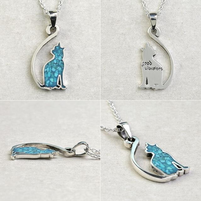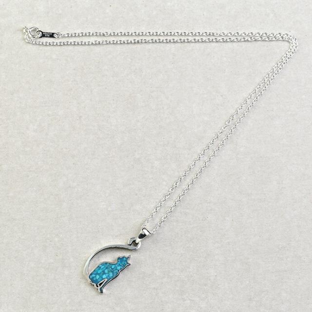 ネコのシルエット状に大小様々なクラッシュターコイズを埋め込んだペンダント。猫のしっぽがバチカンに繋がっている、凝ったデザインのペンダントに仕上がっています。