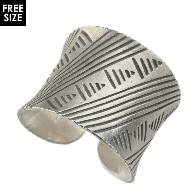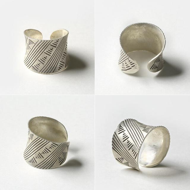 中央がくびれたフォルムに、ラインとトライアングルがデザインされたカレンシルバーのリングです。カレンシルバーとは、タイの山岳民族・カレン族が伝統的な手法で1つ1つ手作業で作り出した、銀純度95%以上のシルバーアクセサリーを指します。マットでざらりとしたテクスチャーが特徴的で、思わず目を惹くアイテムです。