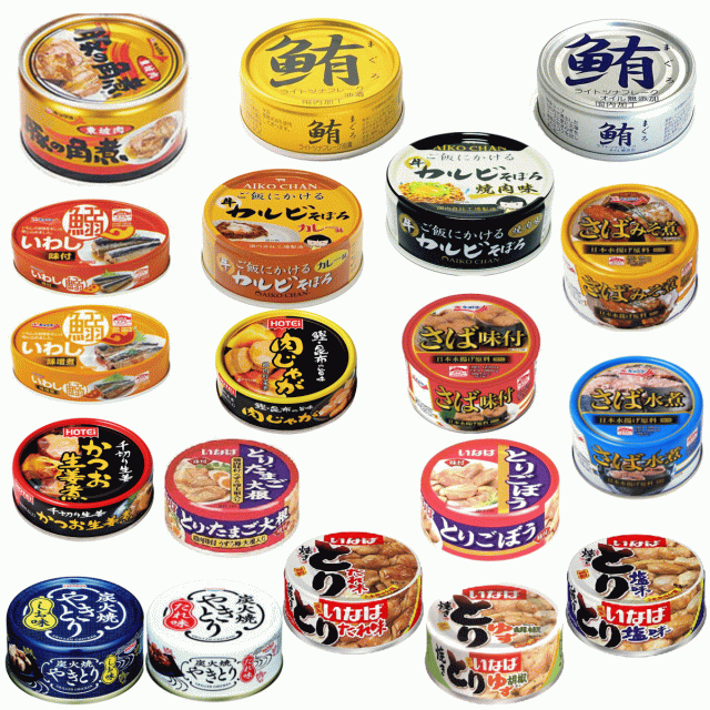 極洋 ホテイフーズ いなば食品 伊藤食品 宝幸から、焼き鳥 たれ味・塩味・柚子味、あいこちゃん、豚の角煮、まぐろ味噌煮・醤油煮、サバの味噌煮・水煮・味付け、イワシ味噌煮・味付け、かつお生姜煮・肉じゃが・とりごぼう・とり卵大根などフレーバー満載の18種セットです。 画像から18種入ります。