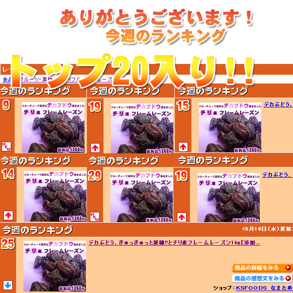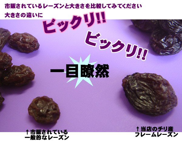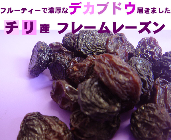 ![]() | チリ産のフレーム種から出来上がる 「フレームレーズン」は 通常のレーズンに比べ酸味が少なく甘みが強く 独特のフルーティーな味が特徴です。 |