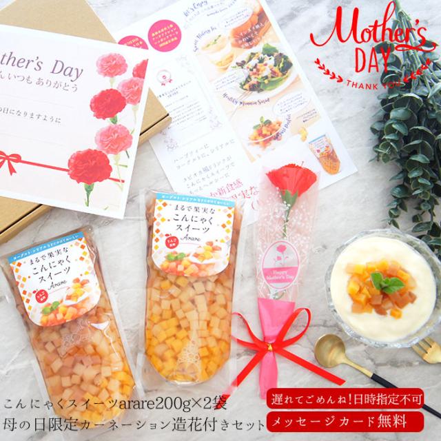 母の日限定 まるで果実なこんにゃくスイーツ りんご味 ARARE 200g×2袋 カーネーション(造花)付き | あられ デザート コンニャク 常温 ホワイトデー チョコ以外 ロカボ