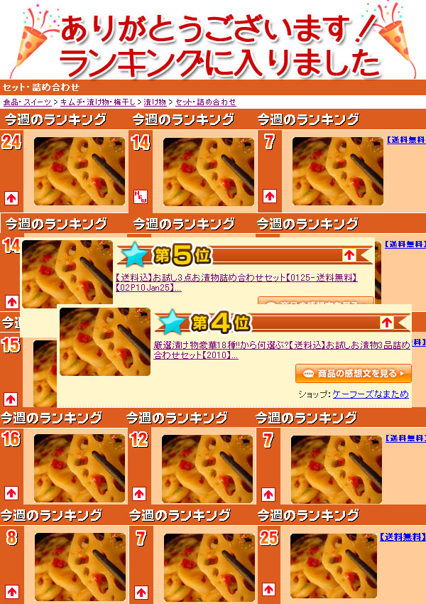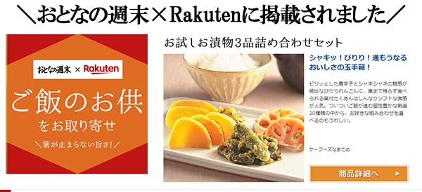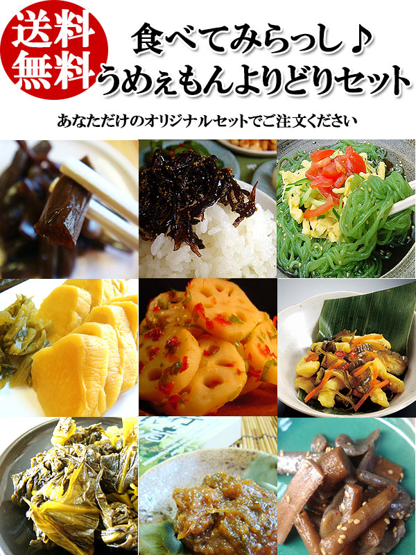 こんな思いを解消します! 「美味しそう!!…だけど、 送料がかかるならまた今度に!」 「お漬物のお店は他にもあるし、 コレ本当に美味しいのかなぁ?」 「気軽に味見できるようなセットが あったらよかったのに・・・」 お客様のお声にお応えして、当店の人気商品をお気軽に お試し頂ける送料込のお得なセットを ご用意しました! 当店取り扱いお漬物商品150品から選りすぐりの商品を抜粋!! ★当店自慢の美味しさを選べる 3点セットでお試しください★ |