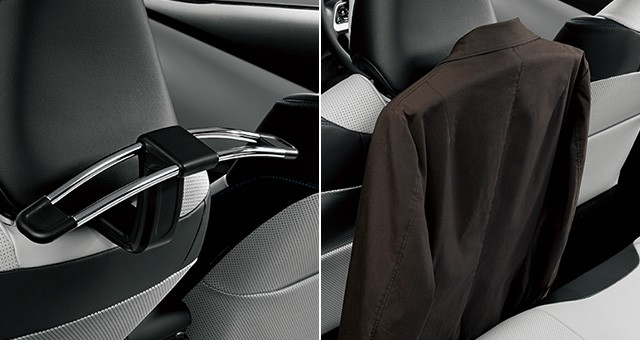 運転席や助手席ヘッドレストに装着してジャケット等を手軽に掛けておくことができる専用ハンガー。