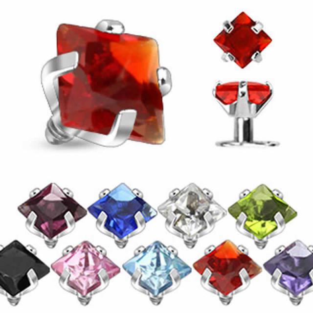 四角形のアクア、パープル、サファイア、クリスタル、グリーン、ブラック、ピンク、レッド、ライトパープルのキュービックジルコニアを4本爪でセットした内ネジタイプのボディピアス用キャッチ。四角いジュエルの大きさも2mmと3mmから選べ、ダーマルアンカーなどの埋め込み型のボディーピアスにも肌へのフィット感も抜群のサージカルステンレス316L製のキャッチパーツ。ネジ山の素材はもちろんサージカルステンレス316L製なので丈夫で安心。