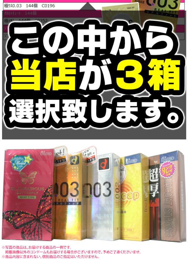 | 商品説明 | ● お財布に負担がない、届くのがめちゃくちゃお楽しみ商品! ● 夜の楽しい生活はこのセットだけで十分! ● アソート4箱セット(1点はお客様選択、3点は当店におまかせください。) ● 必ず41個以上入っております。 |