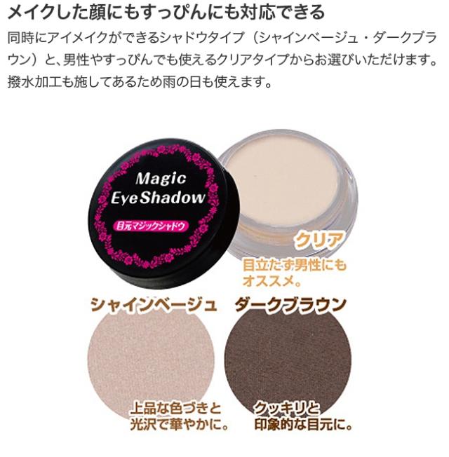 同時にアイメイクができるシャドウタイプ(シャインベージュ・ダークブラウン)と、男性やすっぴんでも使えるクリアタイプからお選びいただけます。