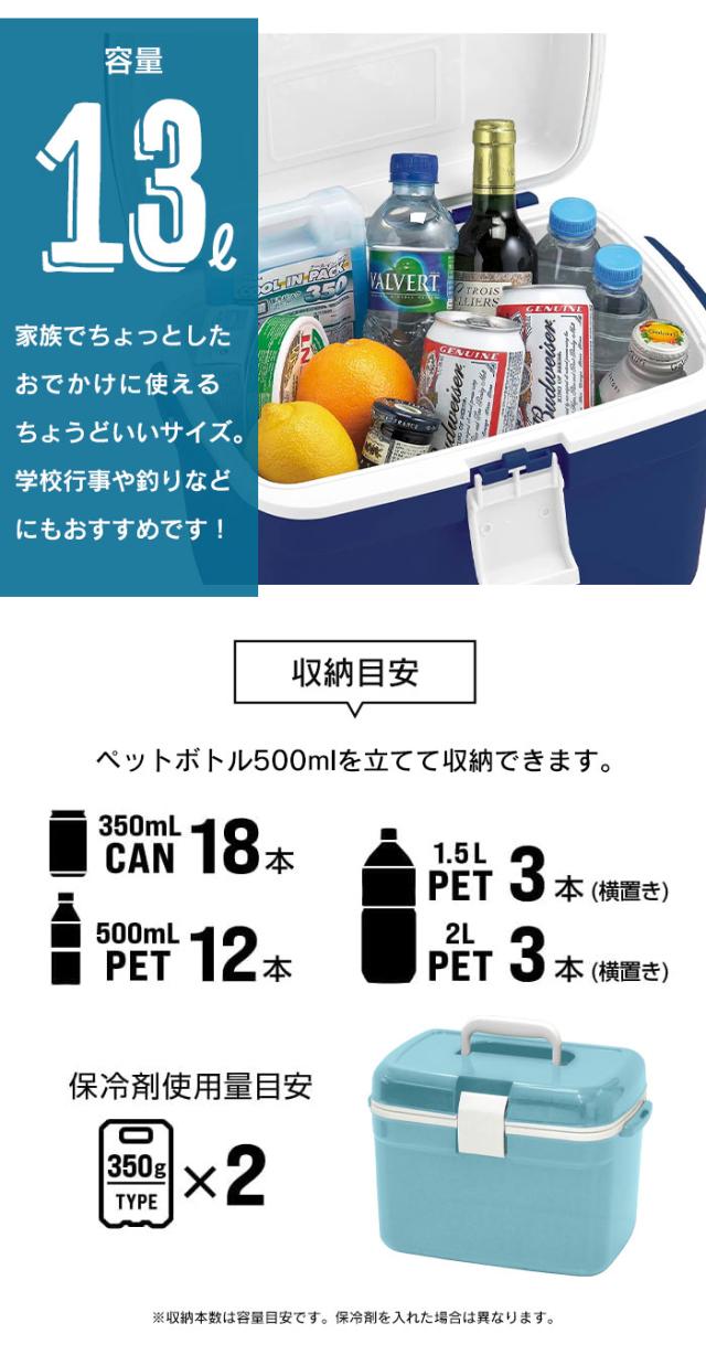 | ・350ml缶×18本 ・500mlペットボトル×12本 ・1.5Lペットボトル(横置き)×3本 ・2Lペットボトル(横置き)×3本 ※収納物の形状により上記の本数が入らない場合がございます。 ※収納本数は目安です。保冷剤を入れた場合は異なります。 |
