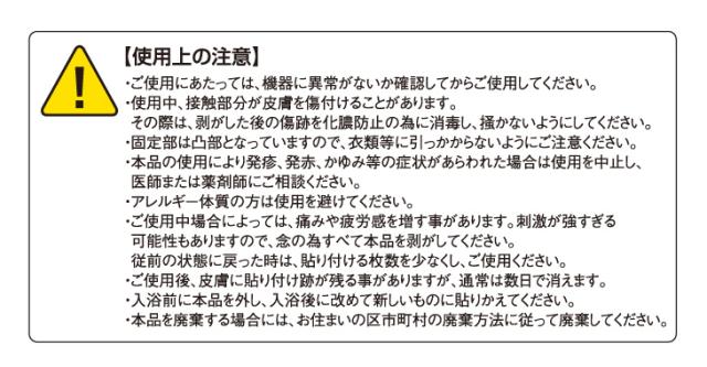 | 注意事項 | ● 肌に傷、湿疹などのある所には使用しないでください。 ● 目の周囲及び粘膜部分には使用しないでください。 ● 貼付した場所が発赤したり、カユミを感じるなど通常と異なる反応を示したり感じた場合は、医師または専門のはり師にご相談ください。 ● アレルギー体質の方は使用を避けてください。 |