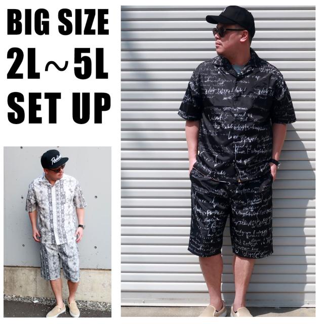 メンズ 大きいサイズ 上下セット セットアップ ハーフパンツ シャツ 2L 3L 4L 5L XL XXL XXXL 上下 上下セット 開襟シャツ オープンカラー 総柄 フラミンゴ ロゴ バンダナ フォト ガールズ プリント 春 夏 秋 大人 30代 40代 50代