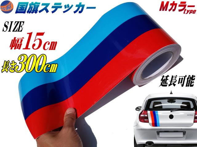国旗ステッカー (Mカラー) 幅15cm×3メートル 【メール便 送料無料】 延長可能 トリコカラー ラインテープ 長さ3m 艶有り グロスカラー カッティング可シート 赤 紺 青 3色シール 300cm フェンダーステッカー サイドデカール ストライプ ボンネット