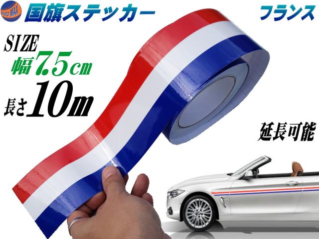 国旗ステッカー (フランス) 幅7.5cm×10メートル 【宅急便 送料無料】 延長可能 トリコカラー ラインテープ 長さ1000cm 艶有り グロスカラー カッティング可能シート 白 赤 青 3色シール 10m フェンダーステッカー サイドデカール ストライプ ボンネット