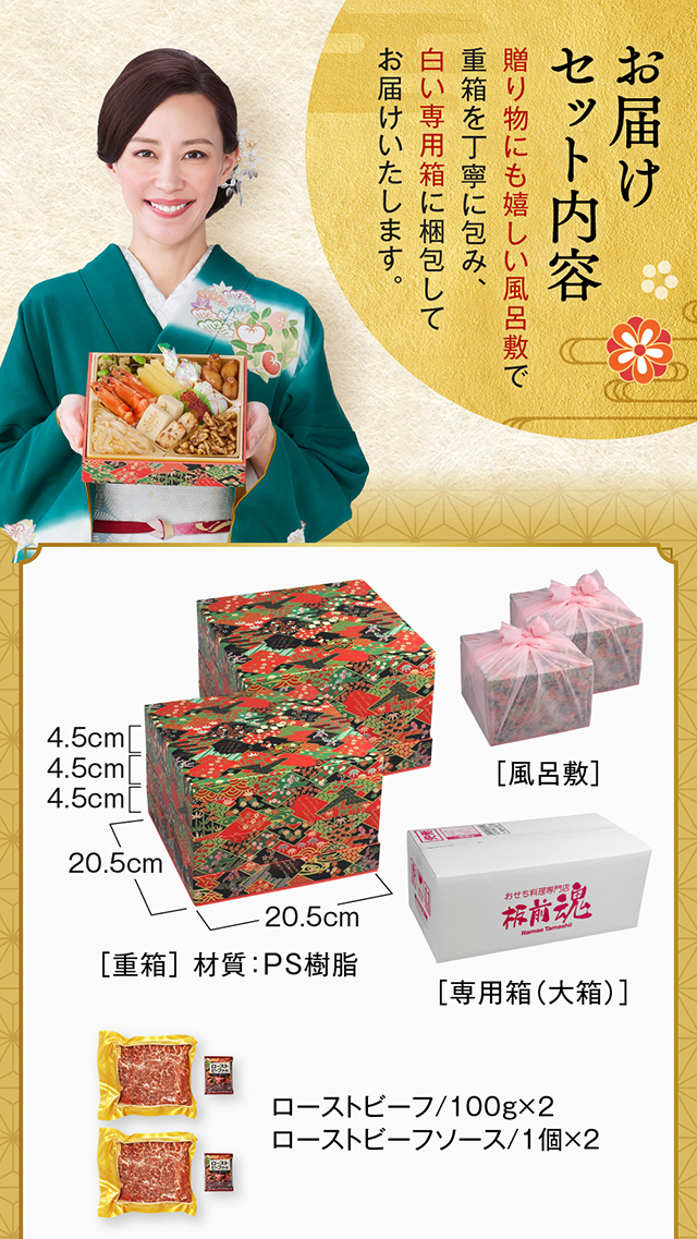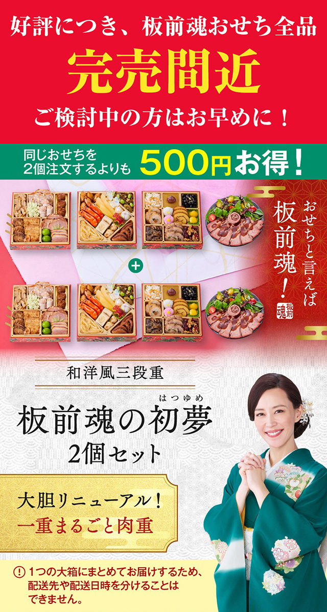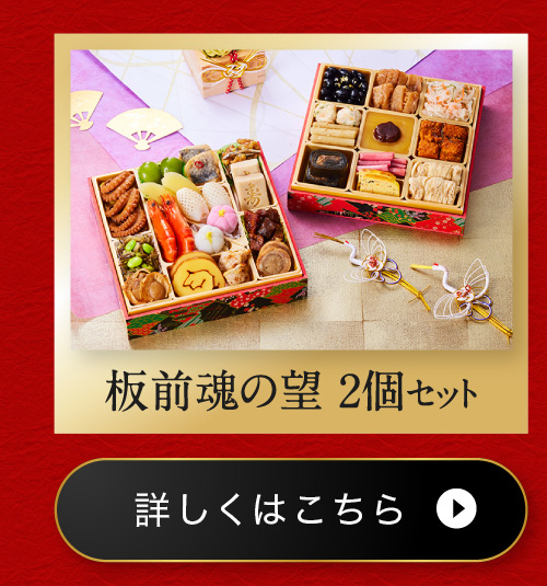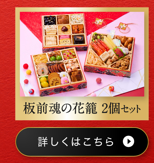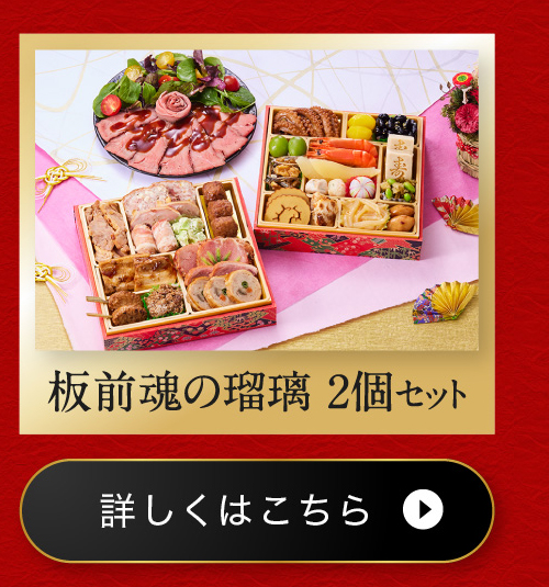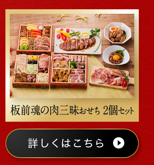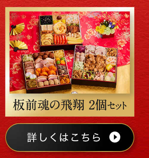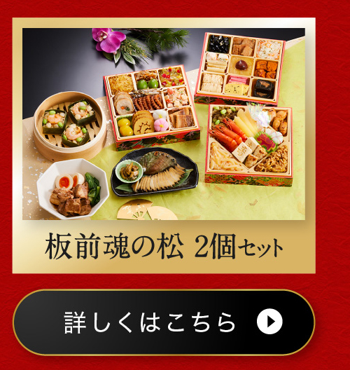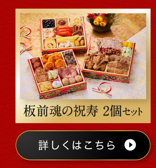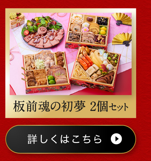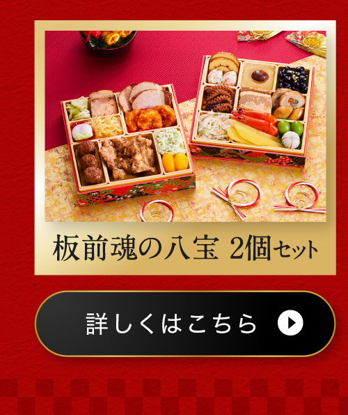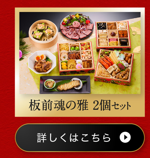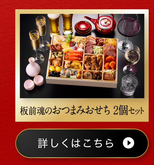 板前魂のおせち料理は、函館、小樽 、仙台、 築地 、山梨、金沢、浜松、 京都 、下関、 博多 、鹿児島など日本や海外の産地をまわり厳選した食材を使用し、有名店やホテルで修行したシェフや繁盛店を営む板長といった4人の匠が監修しています。