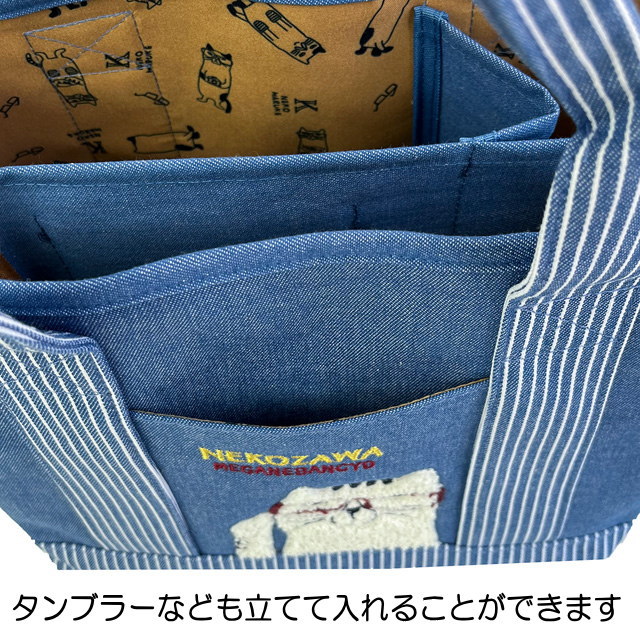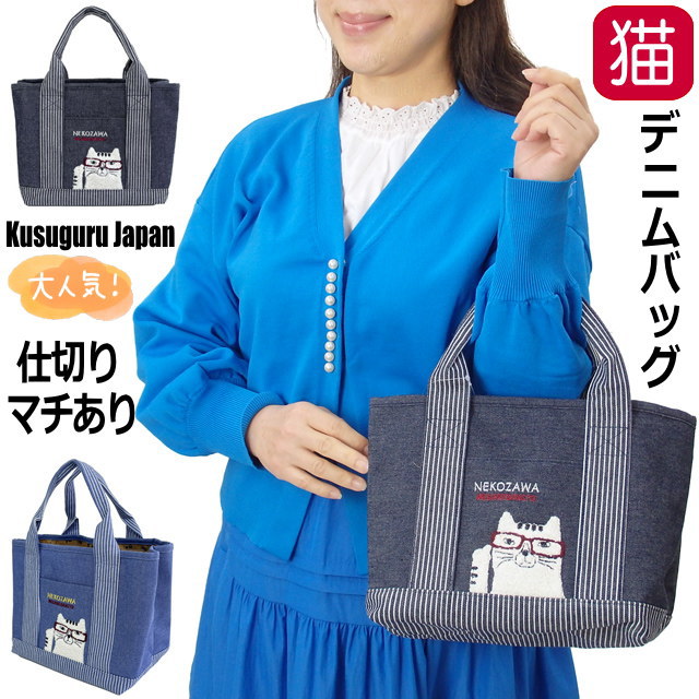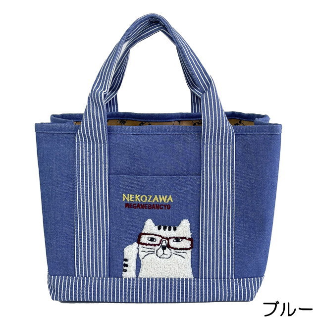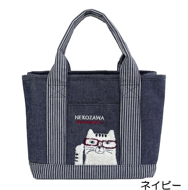トートバッグ レディース S 小さめ 仕切り デニム調 ネコ柄 ネコまるけ 布 手提げ 軽量 人気 アップリケ 刺しゅう ヒッコリーストライプ ブルー ネイビー 猫雑貨 猫グッズ かわいい おしゃれ ギフト プレゼント 【 誕生日 】
