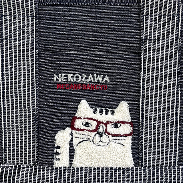 ボリューム感のあるメガネ番長ネコザワさんのサガラ刺しゅうが可愛いデザイン♪