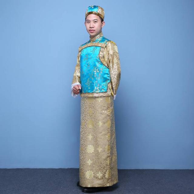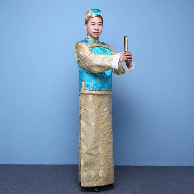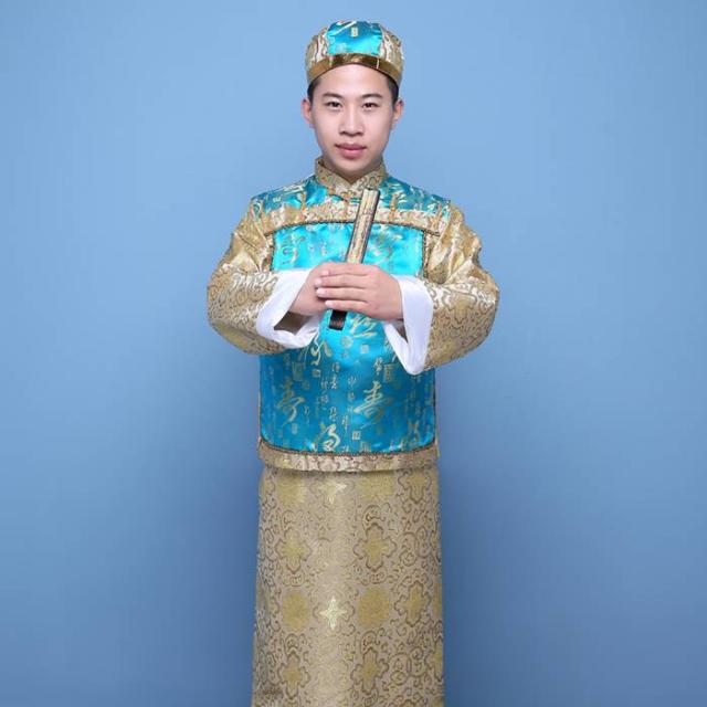 中国清朝服 古装古代地主服 長袍(チャンパオ) サテン地 天藍色