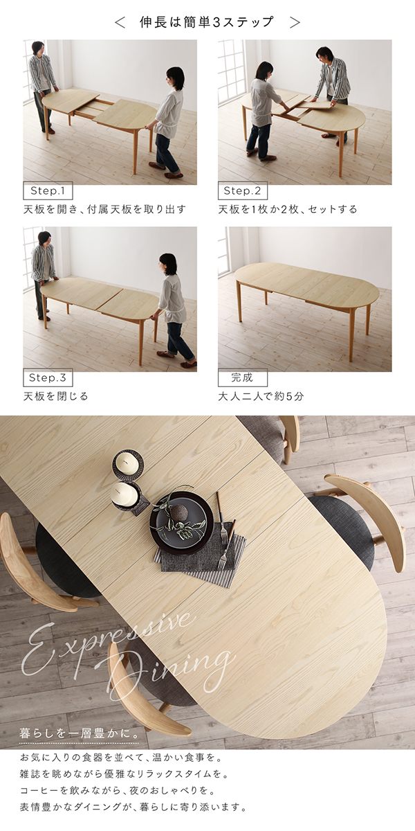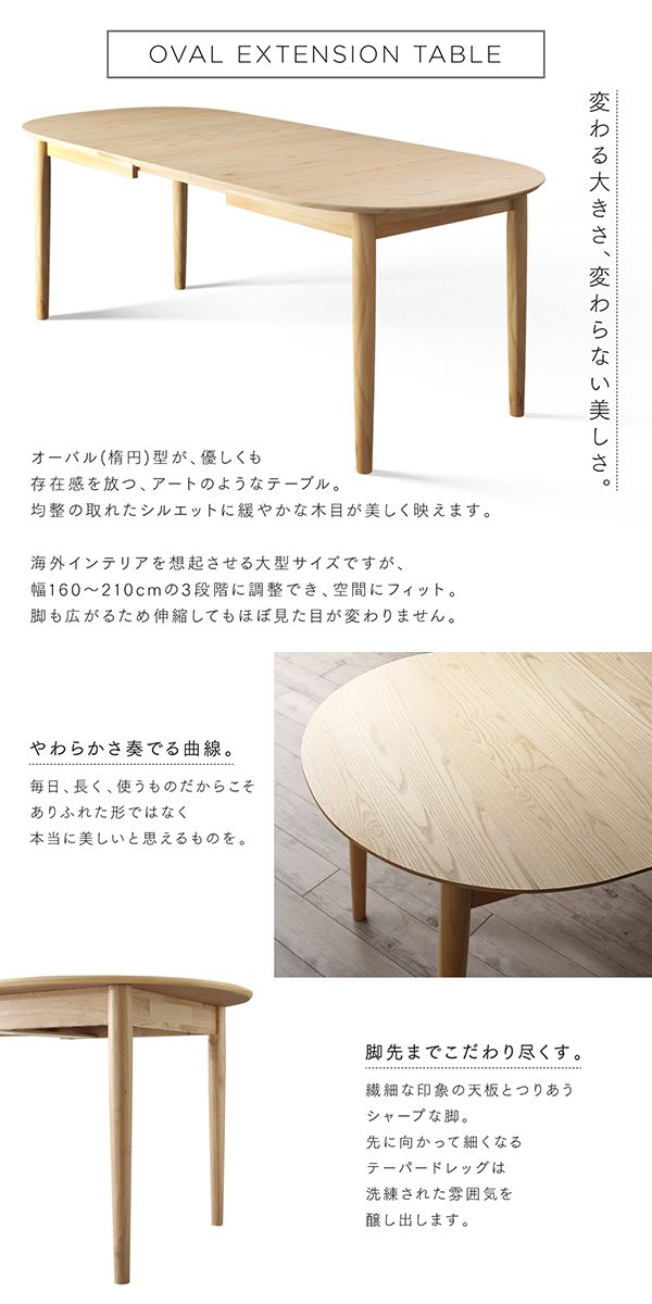 天然木アッシュ材 伸縮式オーバルデザインダイニングシリーズ 〔Chantal〕シャンタル ダイニングテーブル単品 W160-210 ナチュラル