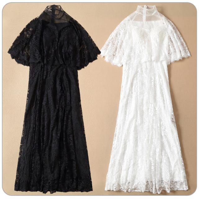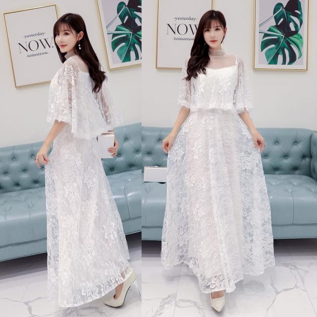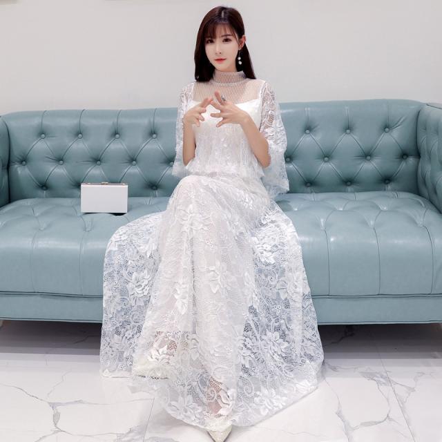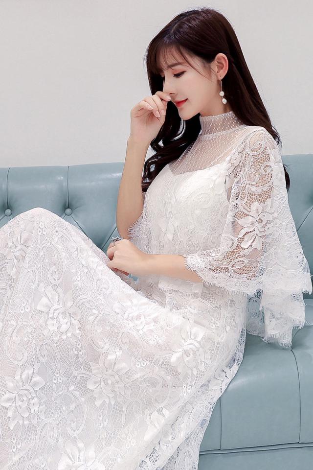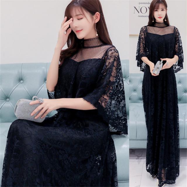パーティードレス 袖あり 大きいサイズ ハイネック 総レース シースルー ロング 七分袖 五分袖 マキシ丈 ロングドレス 20代 30代 40代 新作 フレアスリーブ 韓国ファッション エレガント フェミニン レディース 結婚式 二次会 お呼ばれ フォーマル 婚活パーティー 演奏会