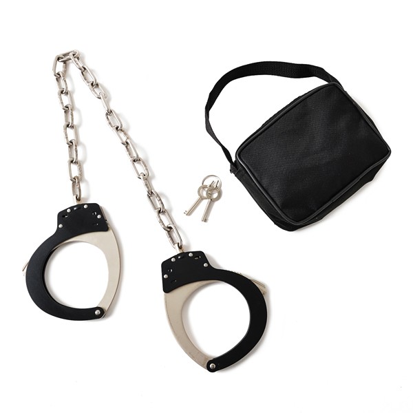 足錠には炭素鋼が使用され、縦・横の製品引張強度はそれぞれ1200N以上を確保しています。連行する時には写真のように前側での手錠拘束でも構いませんが、拘束する場合は後ろ手錠がより効果的です。 手錠と足錠で拘束された犯人は転がされてしまえば、身動きがとれません。