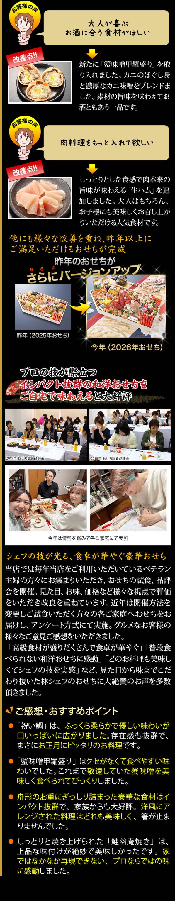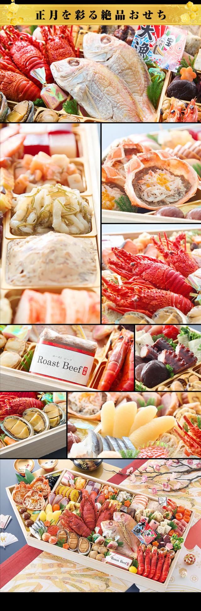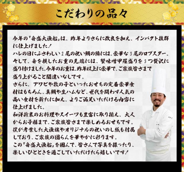 白木の超特大舟形のお重がインパクト抜群のおせち「舟盛大漁船」。林シェフ監修の下“どこにもないユニークなおせち”を目指し、こだわりを詰め込みました。おせちの基本は押さえ、和洋豊かなお料理は家族みんなが食べやすくできております。家族がみんなで食卓を囲む、特別な新年に最適な団らんおせちです。
