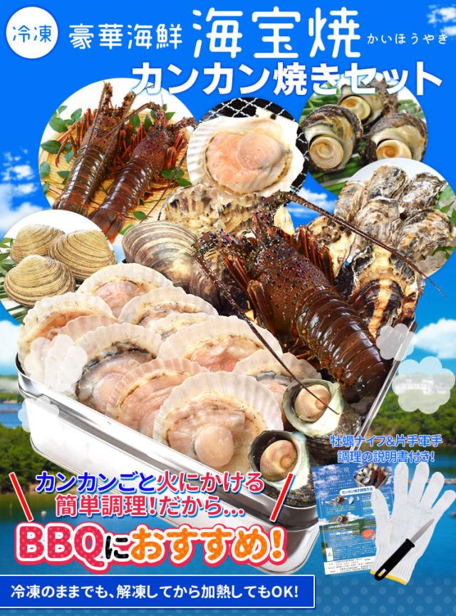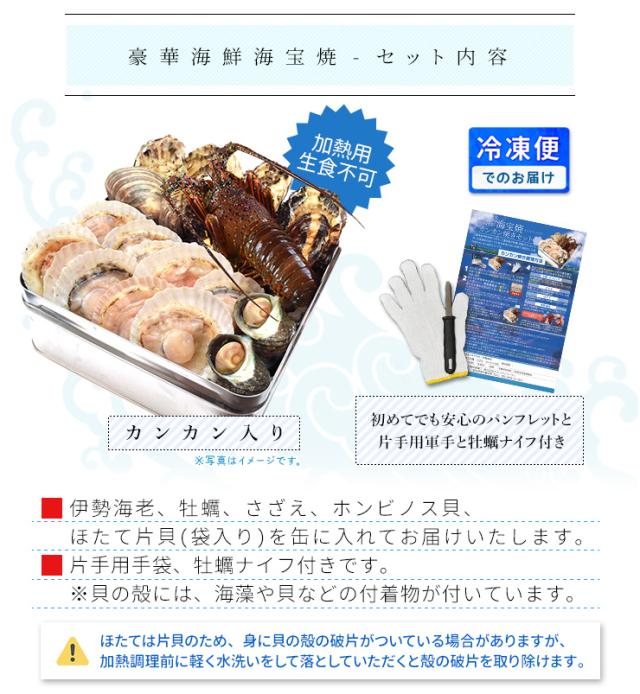 美し国 豪華海鮮海宝焼 カンカン焼き 伊勢海老 大サイズ1個 ほたて 片貝10個 ホンビノス貝2個 牡蠣4個 さざえ2個(牡蠣ナイフ、片手用軍手付)冷凍 海鮮 バーベキュー セット お年賀 ギフト