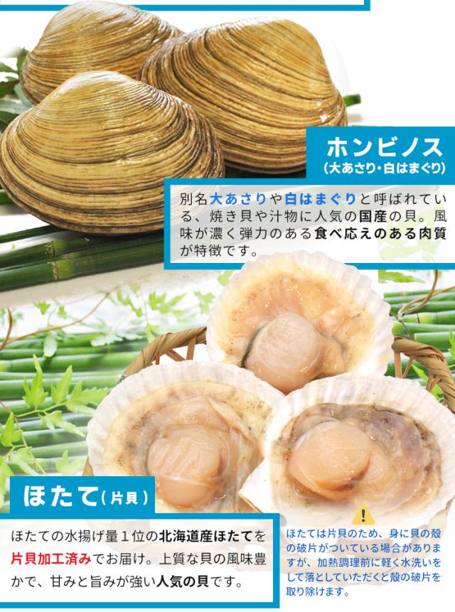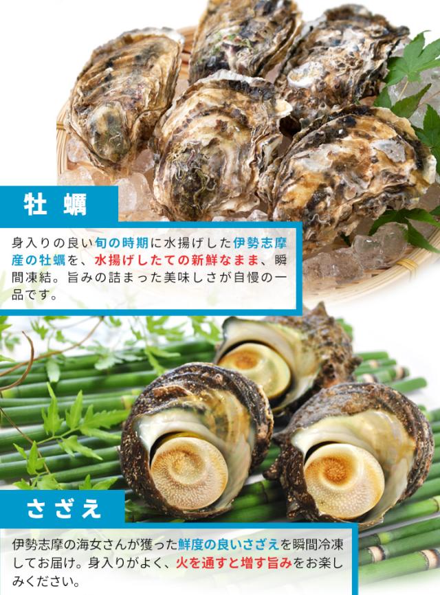 【内容量】伊勢海老中サイズ(200g前後)2個 ほたて片貝10個 ホンビノス貝2個 牡蠣4個 さざえ2個 牡蠣ナイフ・手袋付
