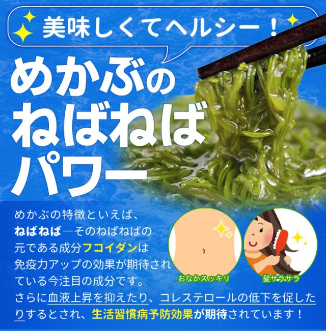 食べたい分だけサッと湯戻し 美味しくってヘルシーなめかぶを毎日手軽にお召し上がりいただけます。