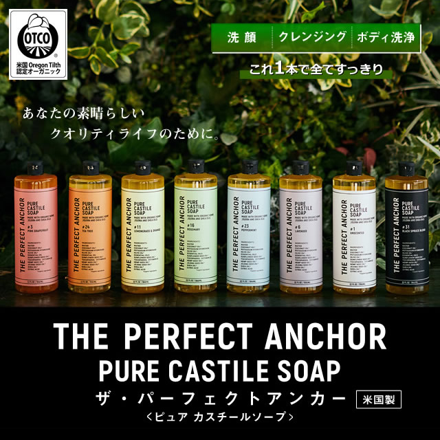 ザ・パーフェクトアンカー 994ml (送料無料) 認定オーガニック ボディーソープ 洗顔 メイク落とし 石けん シャンプー カスチール クレンジング シェービング ハンドソープ ボディ洗浄 アウトドア キャンプ 野外 食器洗い 歯磨き ペット用シャンプー 洗濯