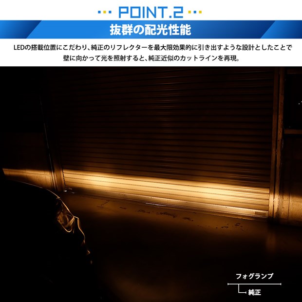 リフレクター性能を最大限効果的に引き出すような設計で純正球の発光位置と同じ位置、灯体の中心にLEDを実装。純正ハロゲンバルブ近似のカットラインを再現しています。