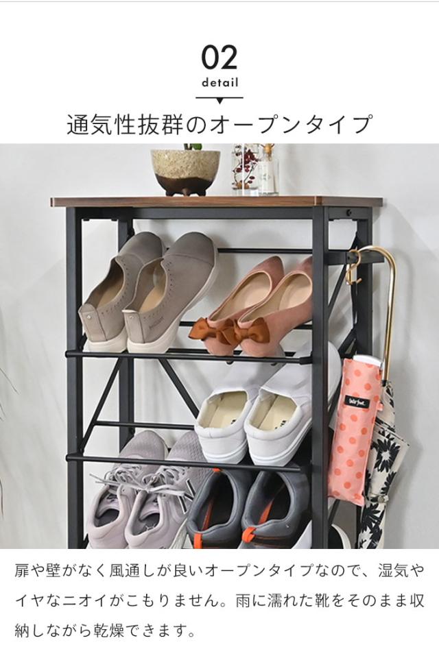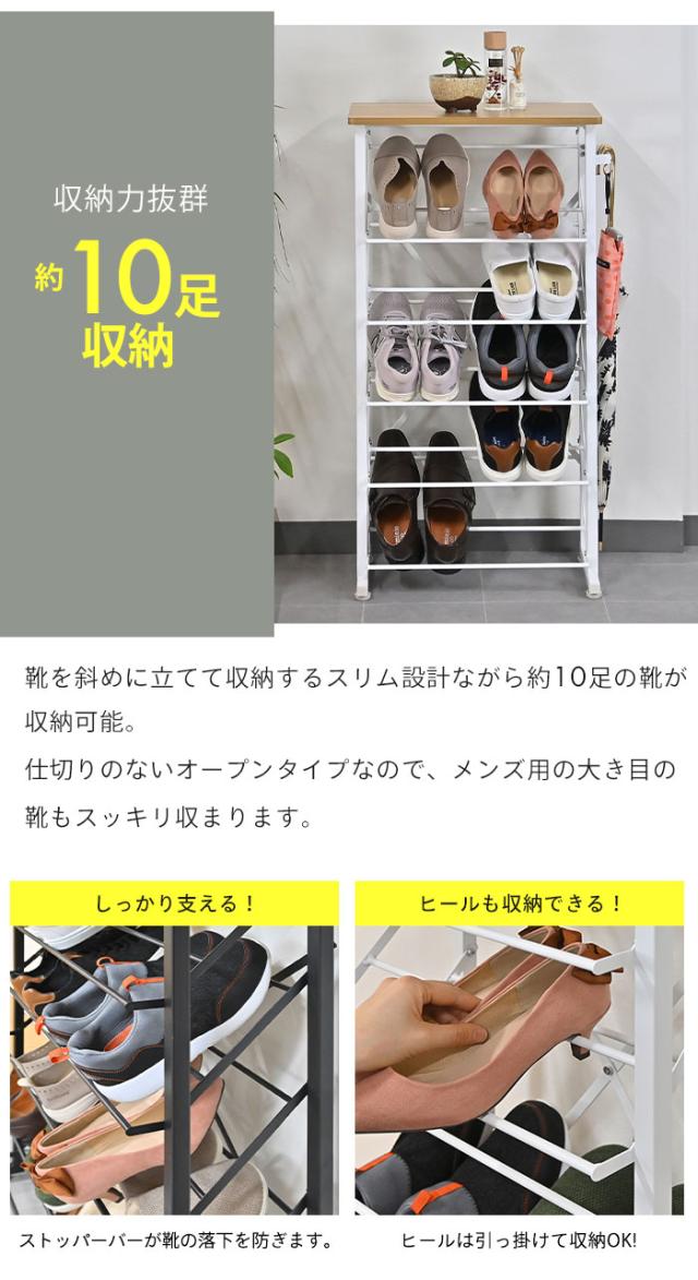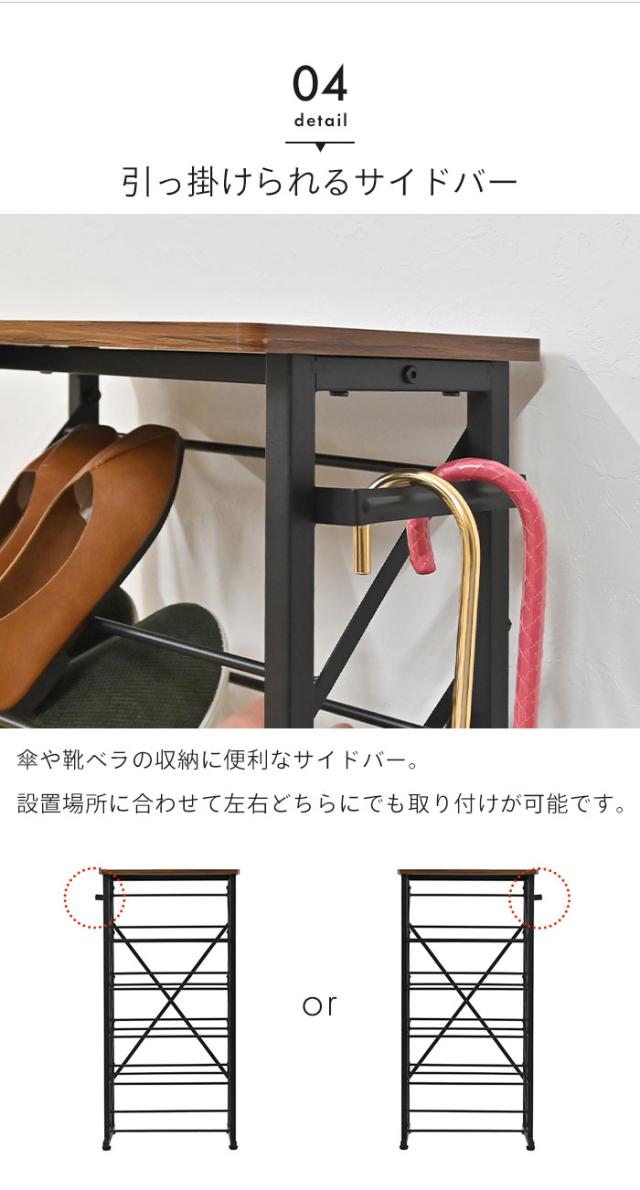 | 奥行わずか25.5cmとスリムなのに、最大10足収納できるシューズラック。 今まで玄関に散らかっていた靴もスッキリ収納できます。 女性用のヒール等も収納OK。 オープンタイプなので、湿気やにおいがこもりません。 天板には小物やお気に入りのインテリアをディスプレイできます。 サイドバーは設置場所に合わせて左右どちらでも取り付けでき、傘や靴ベラなどを掛けるのに最適。 カラーは落ち着いた印象のブラックと、爽やかなホワイトの2色よりお選びいただけます。 |