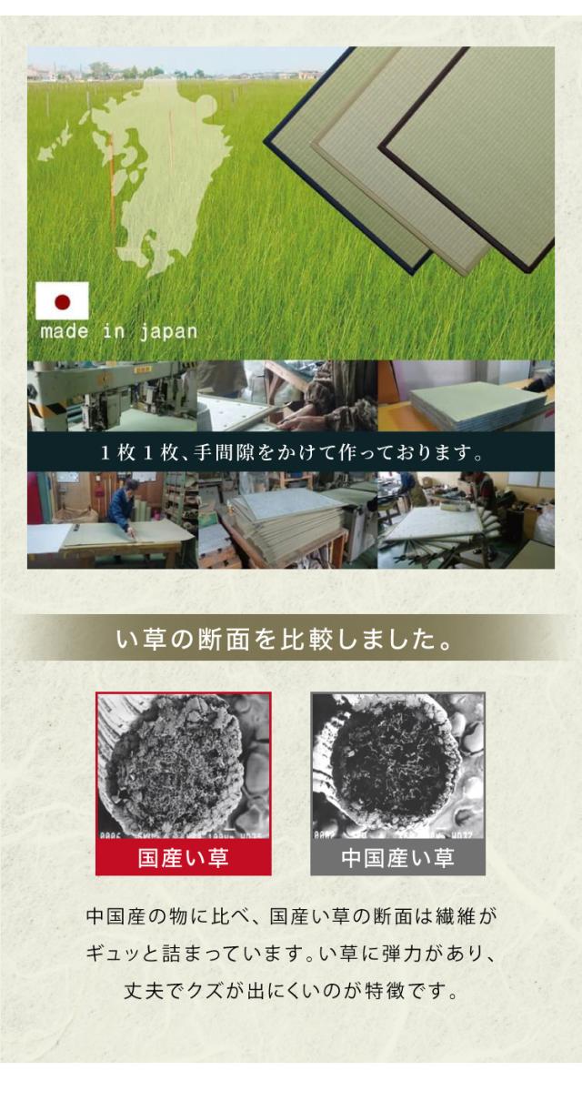 ■ い草は九州産のみを使用。日本の風土で育った安心の草です。一本一本が太く、表皮が厚く繊維がキメ細かいので弾力性があり、耐久性に優れています。