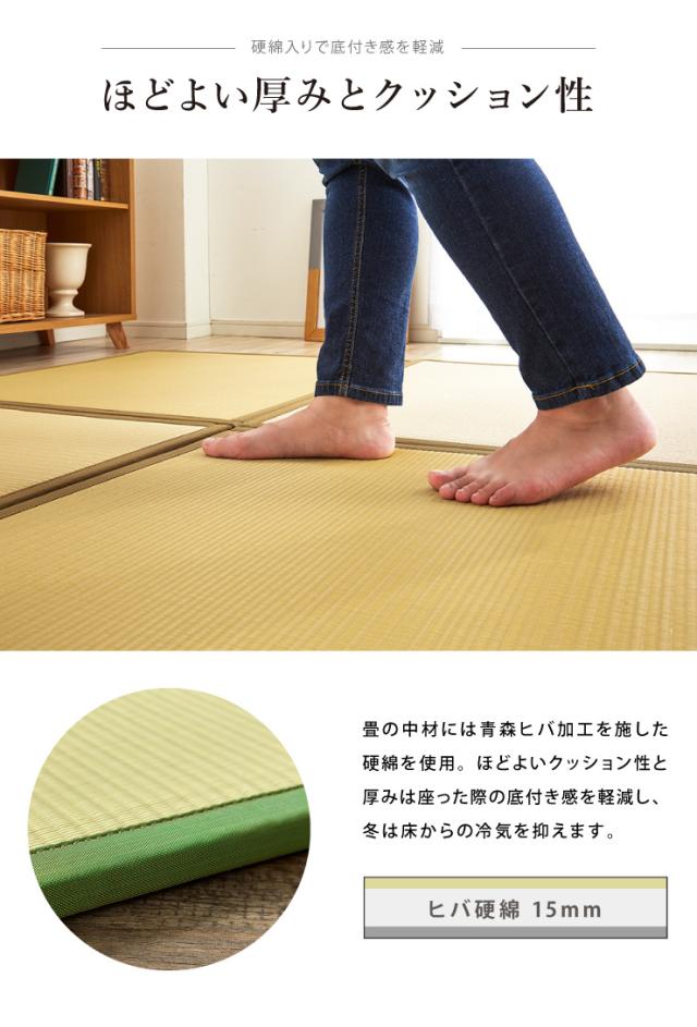届いたユニット畳を床に置くだけで和のスペースが出来上がります。表地にはポリプロピレンを細いパイプ状にして織込んだ生地を使用しています。強度が高くしっかりとしていて、汚れても表面を水拭きできるので、いつでも清潔にご使用頂けます。お子様の部屋に、ペットのいるご家庭に最適な商品です。中材には弾力性にこだわり15mm厚の硬わたを使用しました。硬綿には青森ヒバ加工を施しています。青森ヒバに含まれるヒノキチオールは天然の物質としてきわめて抗菌力が強い成分です(抗菌、防臭効果)。また軽量タイプなので、持ち運び、設置、片づけなども楽にできます。連結用ジョイントを使用すれば、お部屋に合わせて簡単に何枚でもつなげることが出来ます。