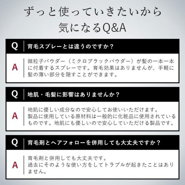 | 商品説明 | スプレー式染毛料。 ふりかけタイプのように、定着剤を使う必要がないから、二度手間要らず!髪の潤い成分マコンブエキス、センブリエキスを配合し、ミクロパウダーが、細毛にハリやコシを与え、頭髪全体をボリュームアップ。スタイリングしながら、簡単に自然な髪を演出します。 白髪かくしに最適。シャンプーで簡単に洗い流せます。男女兼用。 |