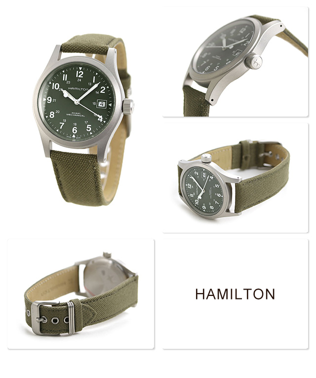 3年保証キャンペーン ハミルトン カーキ フィールド メカニカル 38mm スイス製 手巻き メンズ 腕時計 H69439363 HAMILTON KHAKI FIELD MECHANICAL アナログ グリーン ◆HAMILTON(ハミルトン)はアメリカ発祥の老舗ブランドです。創業翌年に誕生した懐中時計「ブロードウェイ・リミテッド」は、他の時計よりも正確に時を刻むことから鉄道用時計として採用されました。その後も航空用時計や軍用時計として採用されるなど、品質の高さと流行にながされない独自のデザインが世界中の人々に支持されています。 「カーキ フィールド メカニカル」は、「カーキ」ラインの無骨な性格と「ジャズマスター」ラインのシンプルさ、そして洗練をブレンド。ダイアル上のオーバーサイズの数字が司令官にふさわしい大胆なステートメントを創出します。カジュアルスタイルにピッタリです。 機械式腕時計