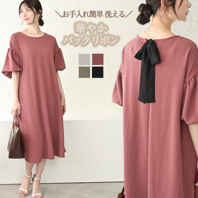 半袖 バックリボン ワンピース レディース ロングワンピース きれいめ 大人可愛い 夏ワンピース 半袖ワンピース 半袖ロングワンピース 春 夏 低身長 ミモレ丈 ぽわん袖 ボリューム袖 バルーン袖 パフスリーブ 二の腕カバー バックリボン ロング 黒 春夏ワンピース